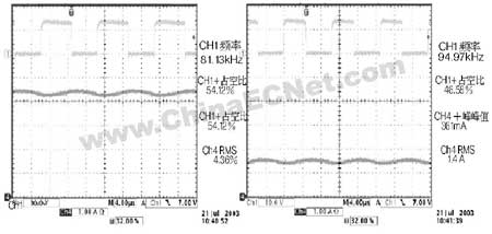 下面的一组工作波形如图7所示。注意到工作频率发生改变,因为 CS5165A 是一个恒定关断时间的控制器。元件C12设置了关断时间的值。关断时间保持固定,而导通时间会根据负载要求而改变。在这种情况下,负载电流改变,将增加LED 阵列上的压降。在经典的稳压器中,占空比根据步降电压比改变。因为电压比随不同的负载电流有效的改变,占空比也发生变化。注意到图7中的波形测量值就可以得出这些结果。也要注意通过L1的纹波电流。