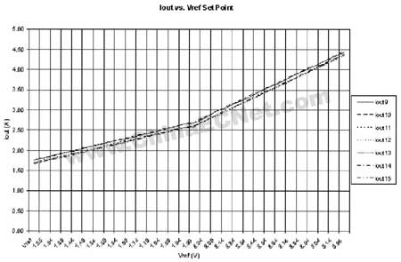 图6中所画的值代表9 V 到15 V测试输入电压的工作情况。注意到设置值从50 mV 步长变到100 mV 步长处有清楚的反射点。通过改变RSENSE1的值可以简单的改变此电路的总体工作范围。也注意到对于各种输入电压,IOUT 的改变很小。
